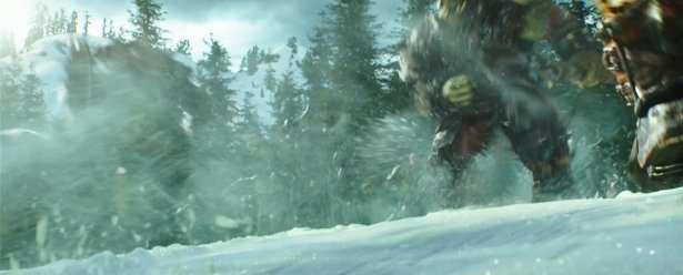 Следующий кадр показывает нам боевые действия на заснеженных горных вершинах. Маловероятно что это Альтерак. Если судить по обилию деревьев, то это Дун Морог - земля дворфов. Если это так, то нас ждут кадры дворфских баталий, которые являются довольно редкими в кинематографе.