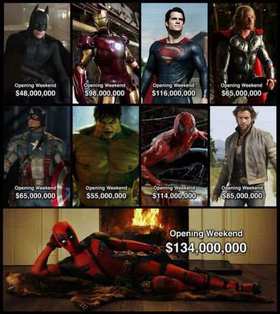 Объявив сиквел «Дэдпула» ещё до премьеры, 20th Century Fox не прогадала, поскольку харизматичный главный герой, любящий колкие шутки, очень уж понравился зрителям. Четырёх дней проката ленте хватило, чтобы окупить затраты почти в пятикратном размере. filmix.day При вложенных $58 миллионах, фильм принёс с кассовых сборов более $260 миллионов. Пожалуй, уже сейчас можно быть уверенным, что нас ждёт не одно продолжение. «Дэдпул» непременно станет полноценной франшизой наравне с «Железным Человеком», «Бэтменом» и другими знаменитыми серями фильмов.Слева можете ознакомиться с таблицей, где указаны кассовые сборы североамериканского региона в первые прокатные выходные у других экранизаций комиксов.